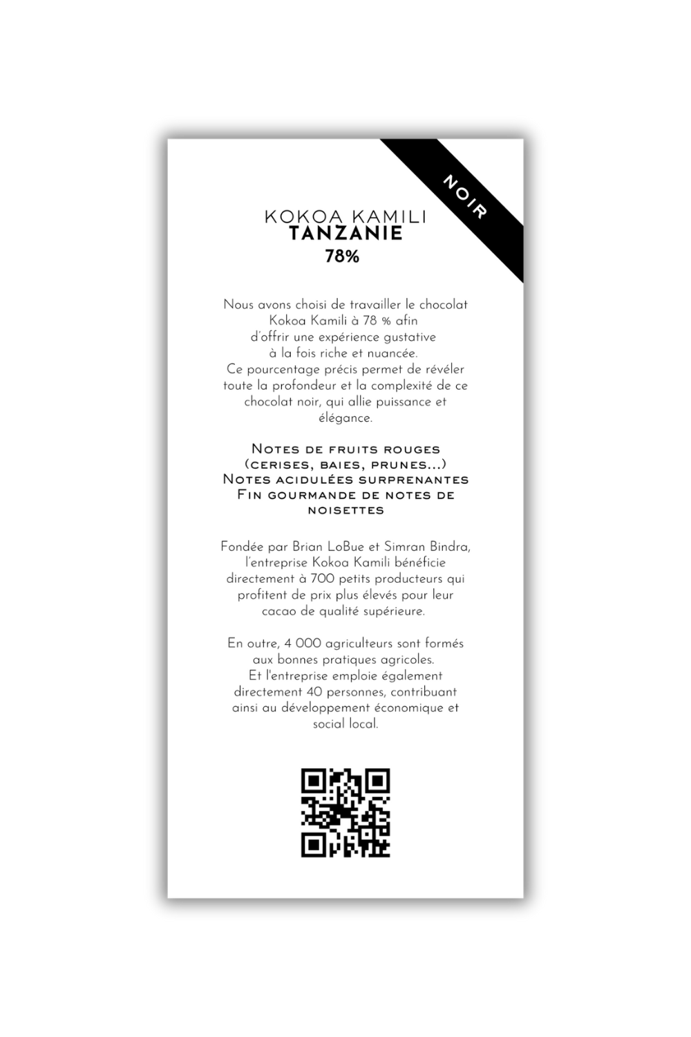 Nous avons choisi de travailler le chocolat Kokoa Kamili à 78 % pour offrir une expérience gustative riche et nuancée. Ce pourcentage précis permet de révéler toute la profondeur et la complexité de ce chocolat noir, qui allie puissance et élégance.